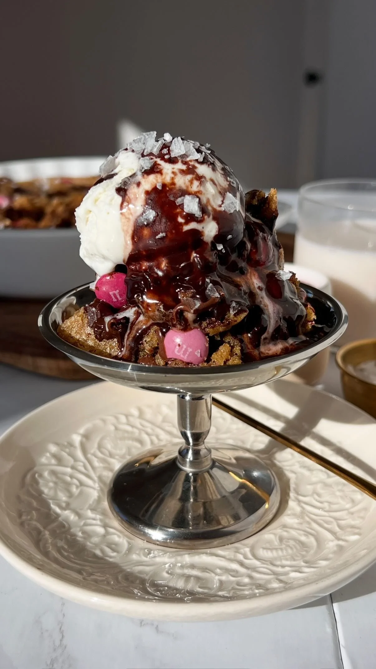 These Scoopable Brown Butter Chocolate Chip Cookies are baked in one pan and scooped warm for the ultimate gooey, shareable dessert. With golden, caramelized edges, soft centers, and melty chocolate chips throughout, they’re finished with flaky sea salt, homemade hot fudge sauce, and a scoop of vanilla ice cream for the coziest cookie skillet–style treat.
